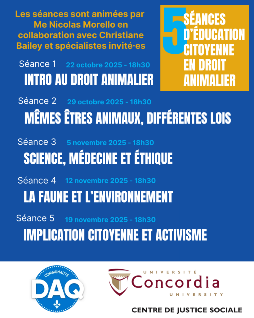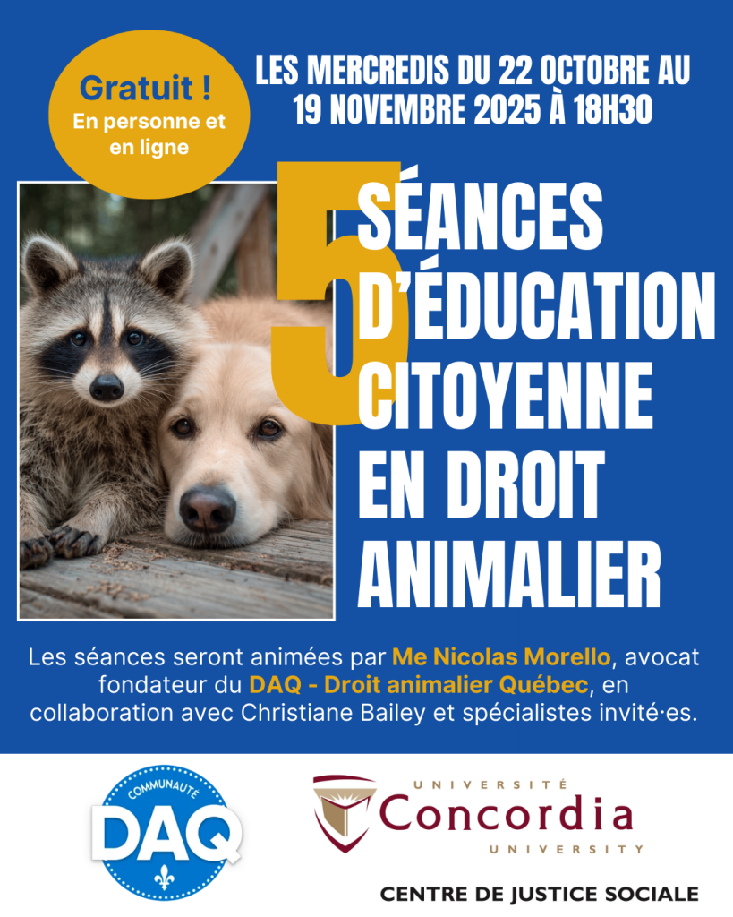 Le DAQ, en collaboration avec le Centre de justice sociale de l’Université Concordia, est heureux de vous informer qu’il diffusera une série de séances d’éducation citoyenne en droit animalier à compter du 22 octobre 2025.
